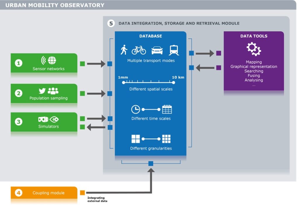 The Urban Mobility Observatory will functionally connect to existing data sources and living labs (4). This will, among others, enable a full integration of traffic and mobility behaviour on the one hand, and spatial data on for example land use, urban densities, land and real-estate prices, locational choice on the other. Mapping and graphical representation of data is another very important means for structuring data, analysing data and for conducting experiments. Therefore, the facility includes tools to represent data on maps (GIS), with virtual and with augmented reality settings.